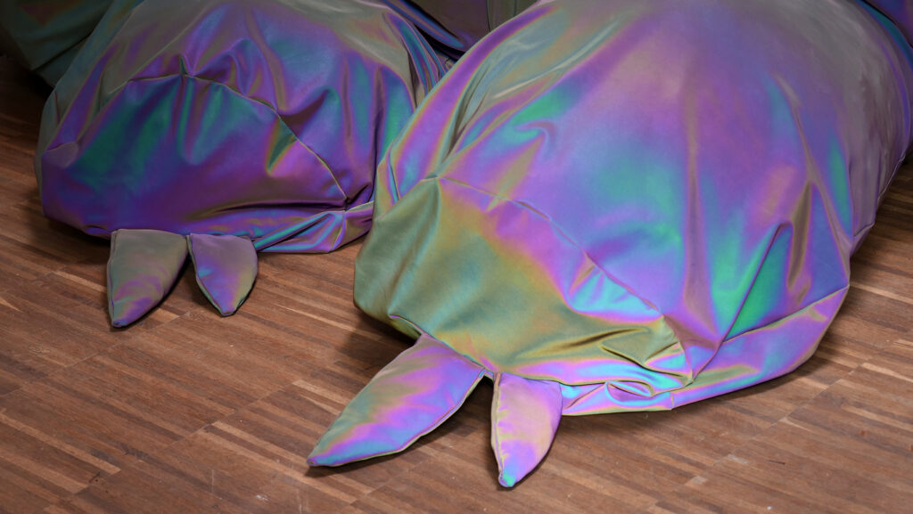 Für dieses Objekt war vor allem eine intensive Materialrecherche notwendig. Für die Füllung haben wir uns für eine Reuse-Styroporfüllung entschieden, da die Besucher der Ausstellung auf dem Kunstobjekt „Platz nehmen“ sollten. Die Optik sollte an einen großen Sitzsack erinnern.